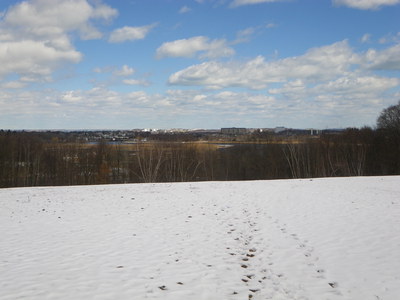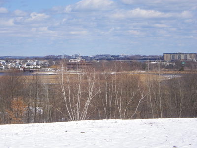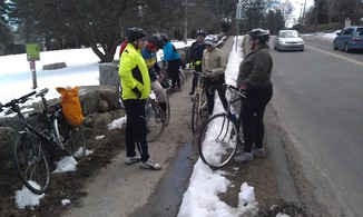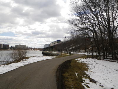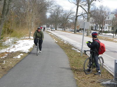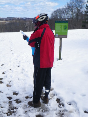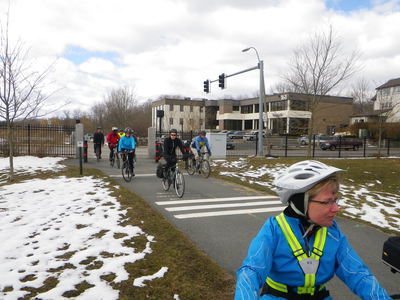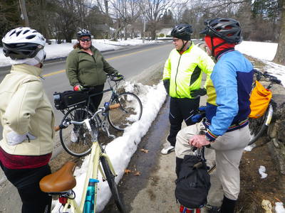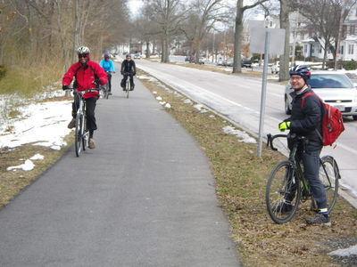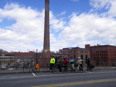 18 of us set out from the southern end of the city of Boston, Paul's Bridge over the Neponset River between Milton and the Readville neighborhood, and followed the Neponset Trail, except for the missing mile, to its current northern end at Tenean Beach in Dorchester. We returned through Quincy and Milton so that we could view the estuary from the top of Governor Hutchinson's Field, near Milton Village. This year, we cut off most of the ride along the harbor because the wind was strong and cold, but we partly made up with it by adding the loop southward through Quincy, connecting over the new Hancock St. Bridge.